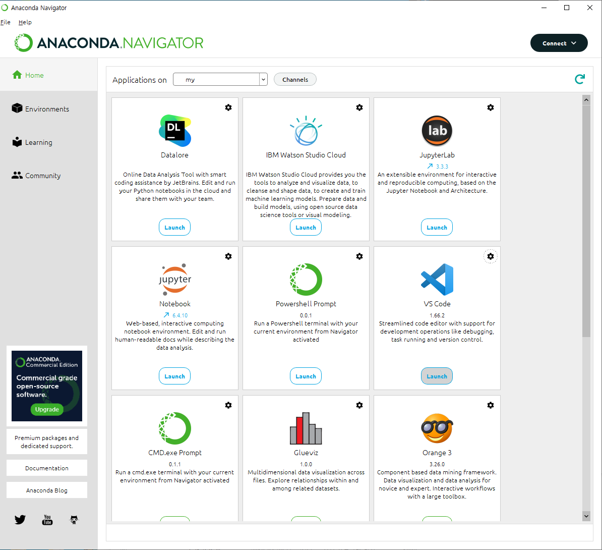 7. 실행시 Anaconda Navigator를 이용하여 Launch 한다.